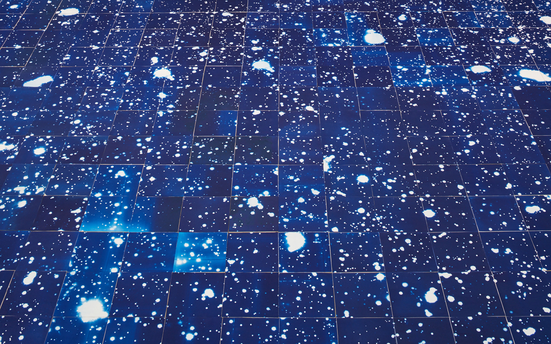 Image: Luminous Ground (detail), 2018/2020, by Ala Ebtekar (active San Francisco and Tehran, b. 1978). Cyanotype on one thousand handmade ceramic tiles exposed by sunlight. Installation view at di Rosa Center for Contemporary Art, Napa, 2018. Commissioned by the Asian Art Museum, courtesy of the artist. Photograph by Johnna Arnold.