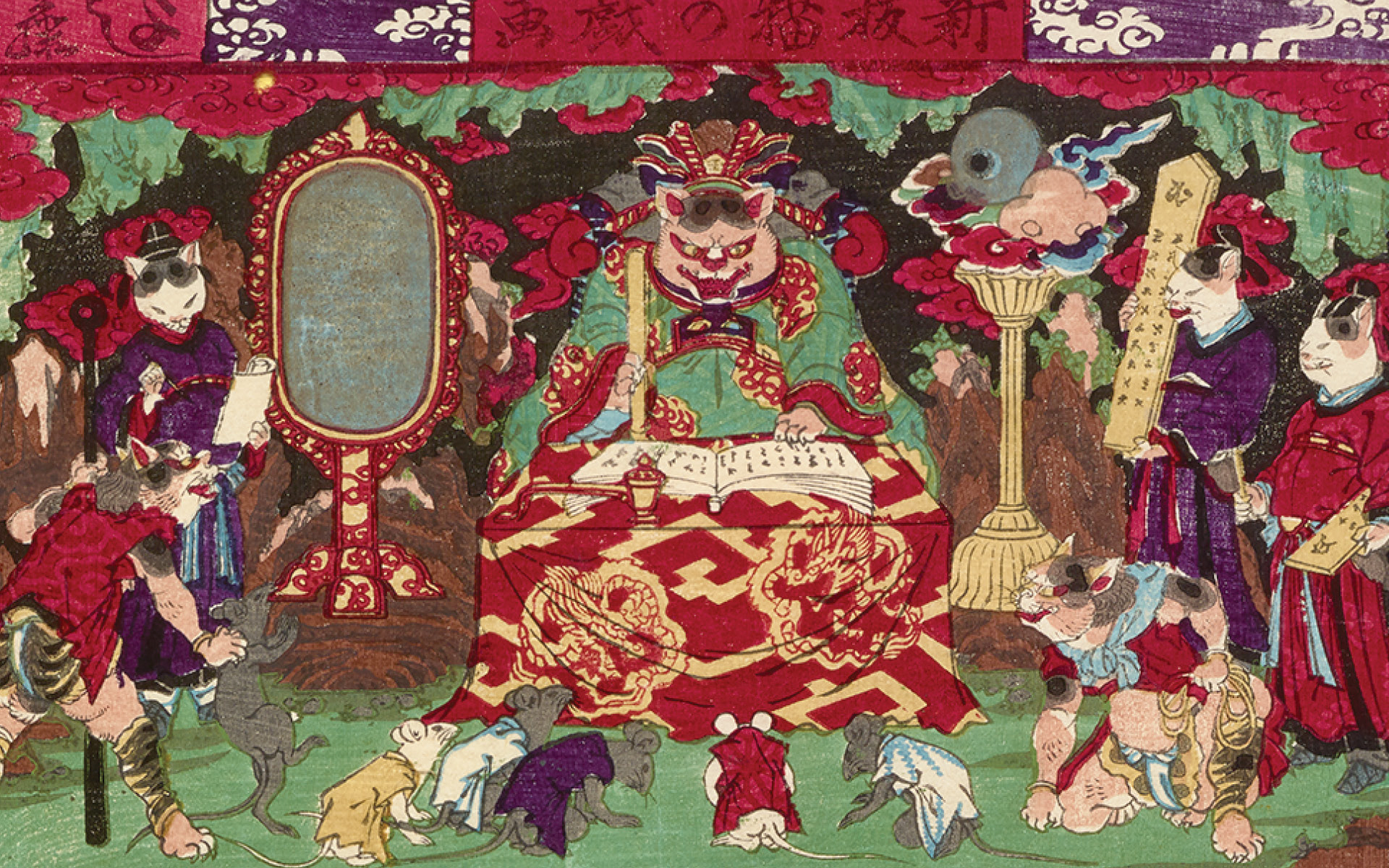 Image: Newly Published Comic Picture of Cats (Shinpan neko no giga) (detail), 1883, by Utagawa Yoshifuji (Japanese, 1828–1887). Meiji period (1868–1912). Woodblock print (nishiki-e); ink and color on paper. Susan L. and C. J. Peters. Photography by Tom Dubrock.