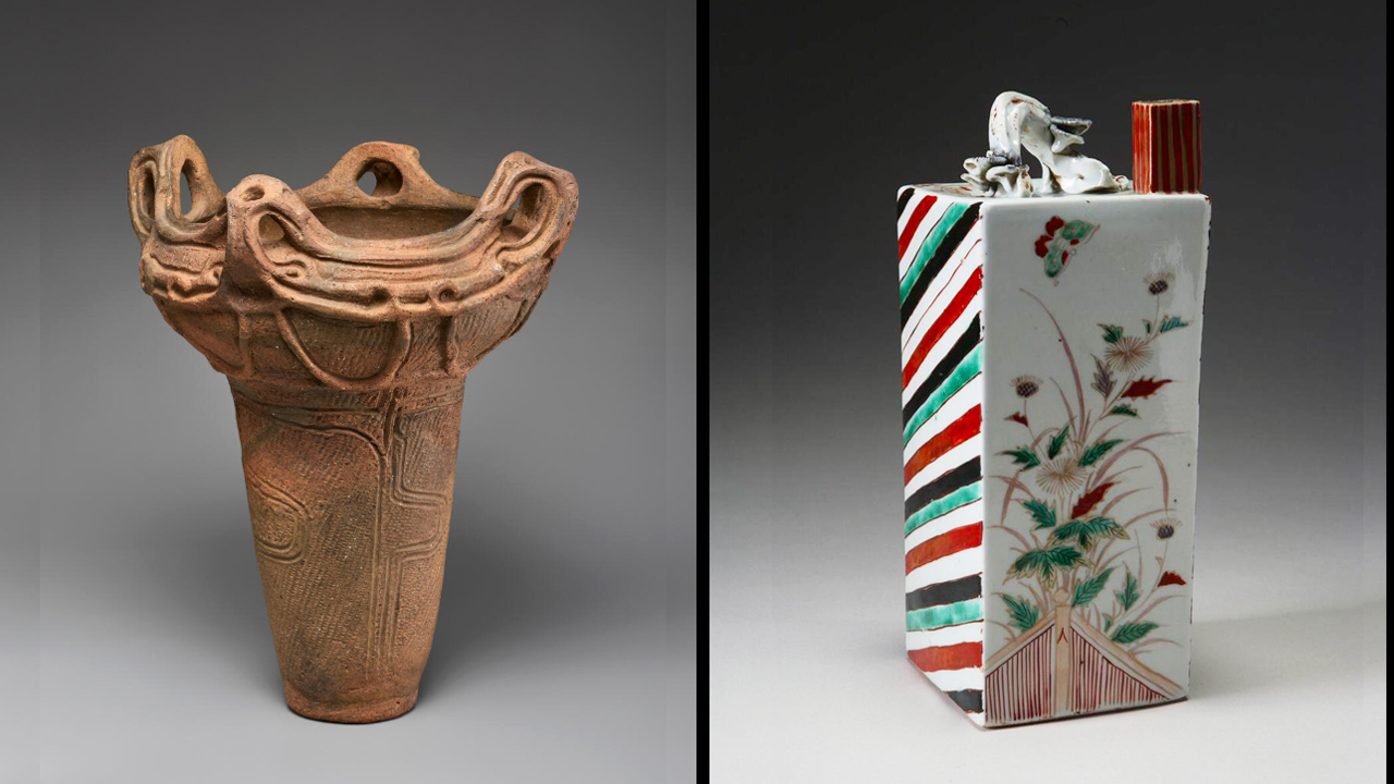 Image: Jar with handle-like ornamentation, 3000–2000 BCE. Japan; Kanto region. Jomon period (10,500–300 BCE). Earthenware. Asian Art Museum of San Francisco, The Avery Brundage Collection, B60P932. Square sake bottle with stripes, thistles, and butterflies, approx. 1740-1760. Japan; Arita, Saga prefecture. Edo period (1615-1868). Porcelain with enamels and gold over clear glaze. Asian Art Museum, AS183567. Photography © Asian Art Museum of San Francisco.