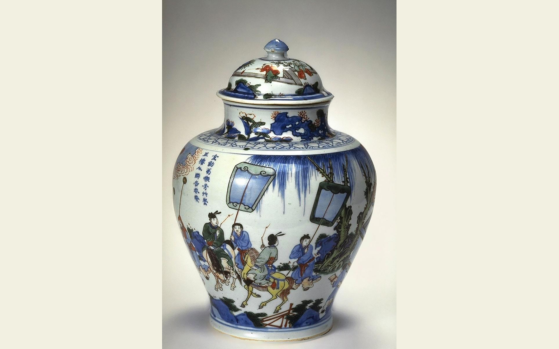 Image: Jar with farewell scene, 1662–1722. China; Jingdezhen, Jiangxi province. Qing dynasty (1644–1911), Reign of the Kangxi emperor (1662–1722). Porcelain with underglaze blue and overglaze multicolor decoration. Asian Art Museum, The Avery Brundage Collection, B60P58.a-.b. Photograph © Asian Art Museum of San Francisco.