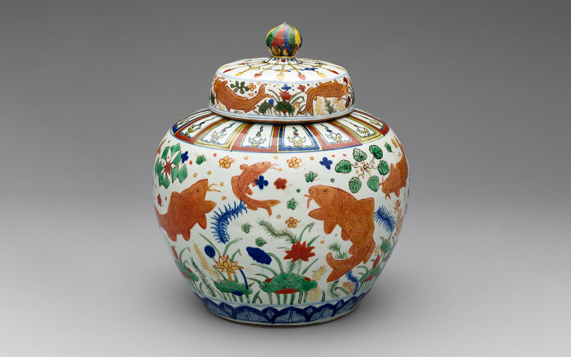 Image: Lidded jar with design of a lotus pond China; Jingdezhen, Jiangxi province Ming dynasty, reign of the Jiajing emperor (1522–1566) Porcelain with underglaze blue and overglaze multicolor decoration The Avery Brundage Collection. Photograph © Asian Art Museum.